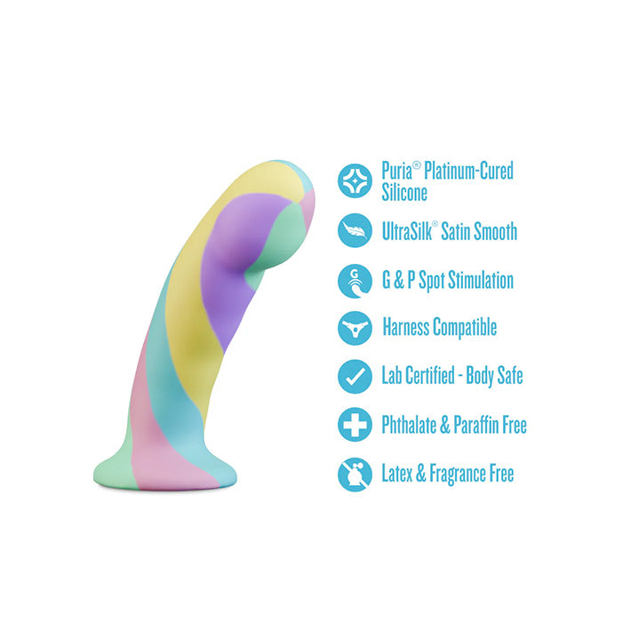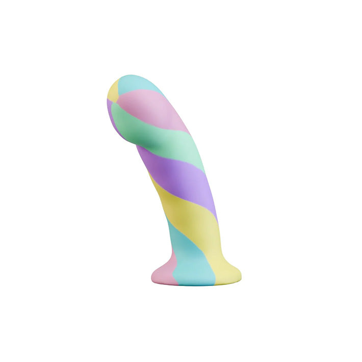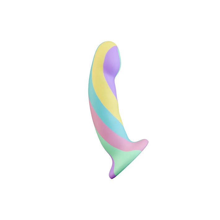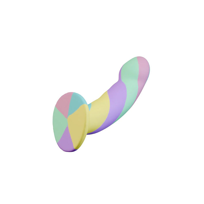 5 inches of semi-pretentious Platinum-Cured Silicone in a pastel swirl of colors wants to guarantee your satisfaction with it's "artisan-made shape that's been sculpted for your comfort." This non-realistic dildo even warms to the touch giving it a lifelike feel while you play. A broad smooth head and curved, seamless shaft reach your G-Spot with ease and minimal friction. This sex toy is even waterproof, so it can remind you of it's magnificent prowess under water.