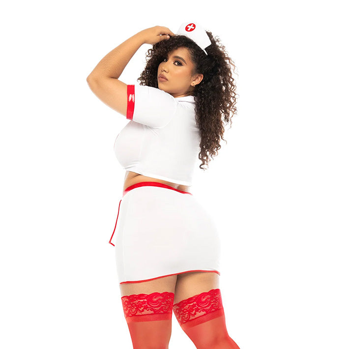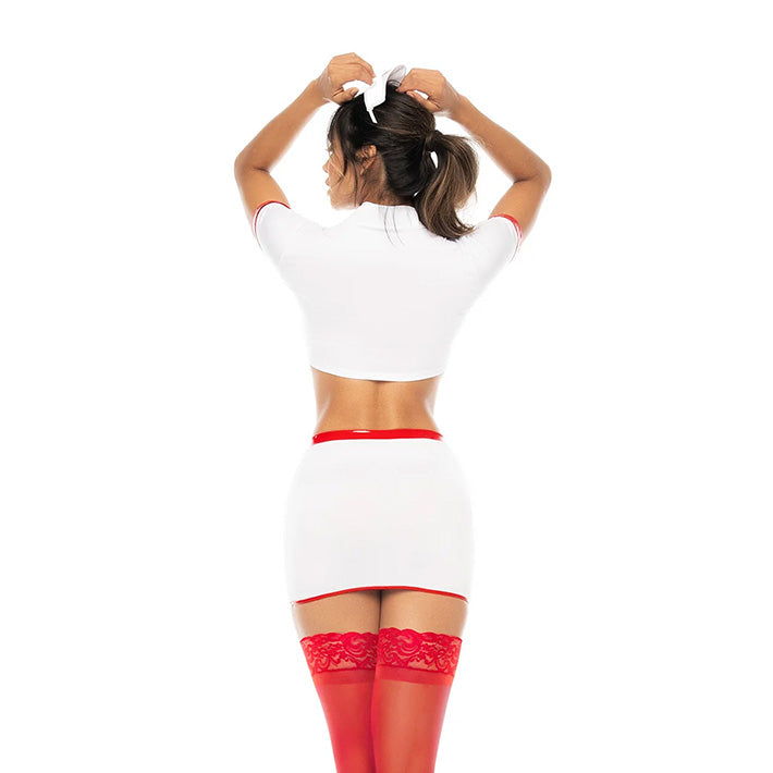 You can't be held responsible for all the hearts you break in this utterly arresting nurse outfit. The zippered crop top can be left at any level to display as much or as little of you as you like. The mini skirt features an attached apron for all your dirty work you'll be doing while nursing and the matching headpiece lets everyone know that there is a nurse present to see to everyone's....health.