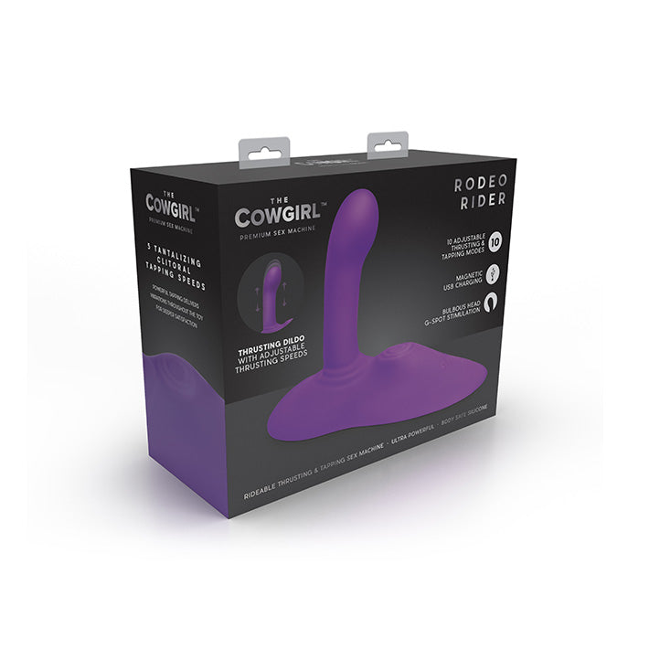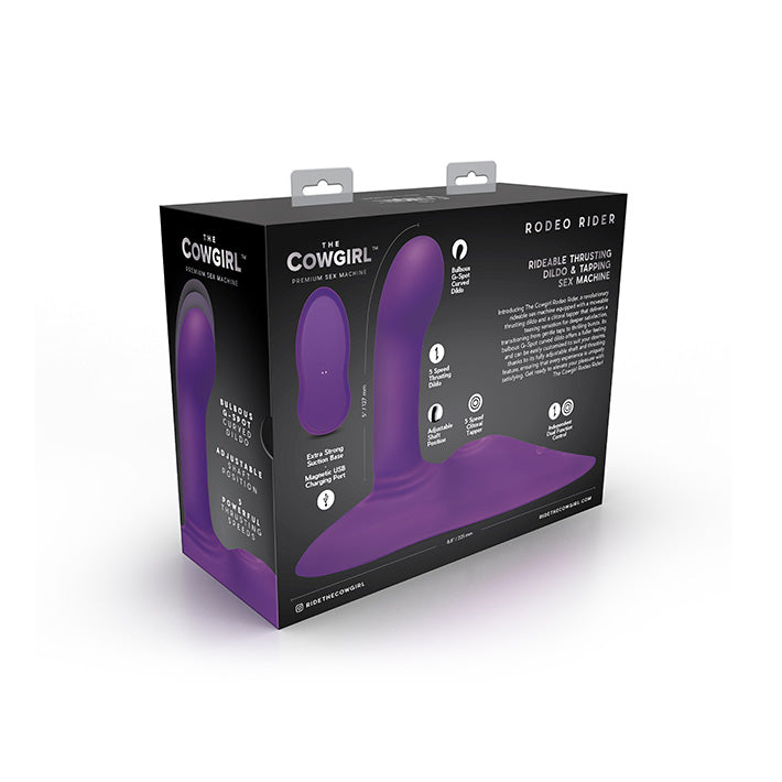 Climb onto the fully adjustable thrusting dildo and feel the enjoyable fullness and intense G-Spot stimulation the bulbous head provides. Grind as you ride and enjoy blended orgasms thanks to the clitoral tapper in the base of this G-Spot vibrator. Use the simple remote control to take a different ride every time as you cycle through 5 thrusting speeds and 5 tapping speeds. The Cowgirl Rodeo Rider is fully waterproof so you can even ride this steed in the seas (or masturbate in the shower).
