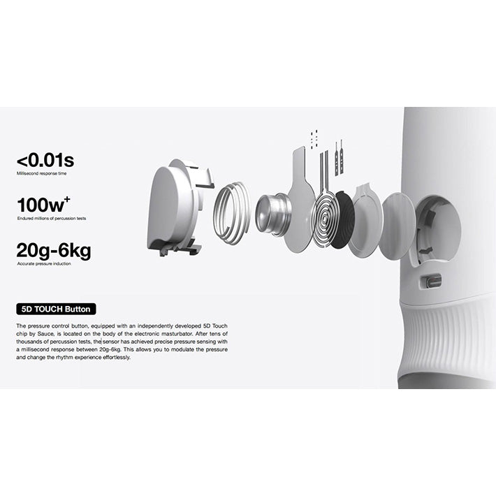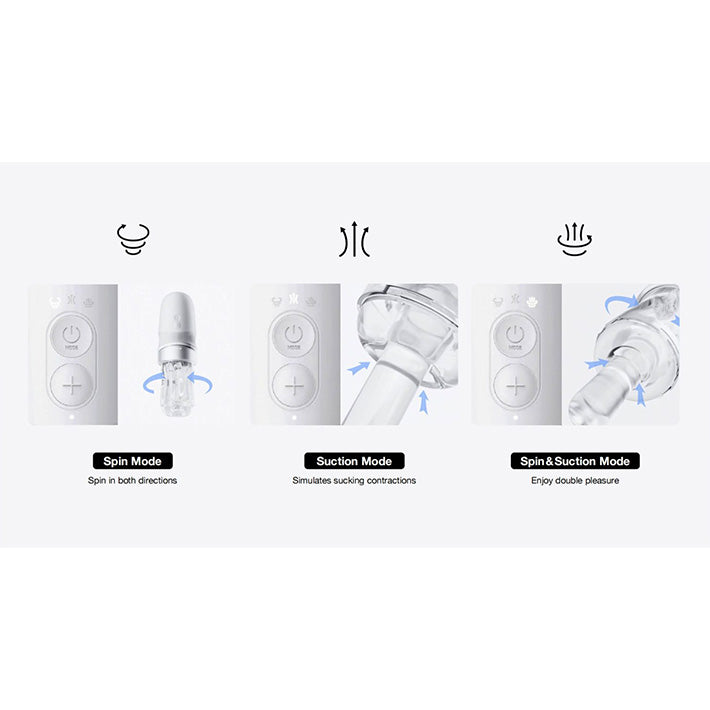 A one-of-a-kind 5D Touch Technology button allows you to adjust the settings and stimulation with just the pressure of your finger. A lighter touch slows the spin and suction. A firmer touch increases the intensity. Play stress free thanks to the soft, supple, and body-safe TPE sleeve and the easily detachable stroker cup that makes cleaning a breeze.