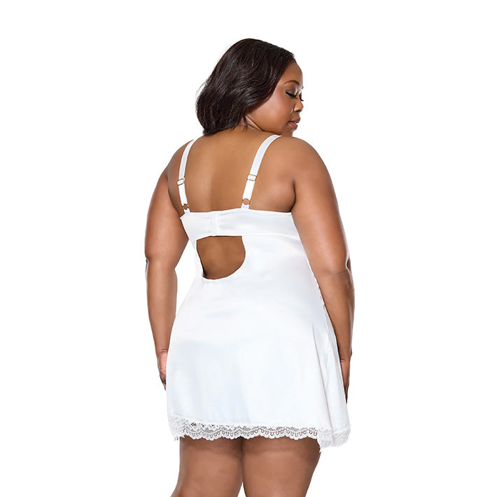 The real romance comes from how you'll always feel about this gorgeous chemise! Smooth satin stretches and floats over your curves for a super comfortable wear, while lace trim adds interest and romance to this classic lingerie look. Soft and supportive cups keep things where you want them while the side slit on the skirt gives an extra view of you as you move.