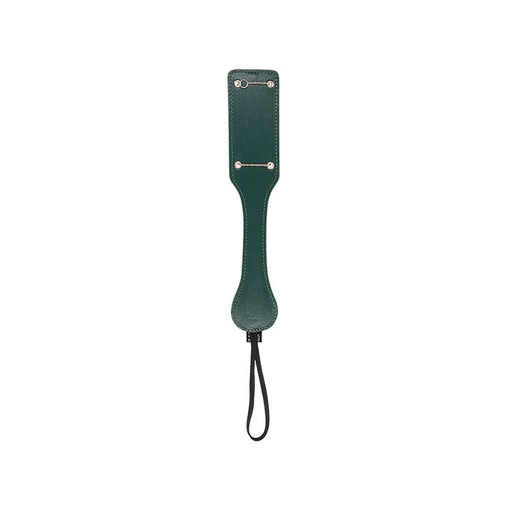 As gorgeous as it is effective, this paddle leaves quite an impression. A piece of BDSM gear that's as worthwhile to display as it is to experience, you'll love the deep emerald green of the faux leather and the inlayed gold chain. The convenient wrist loop keeps this well balanced sex toy firmly in your control, and the chain provides varied stringing impact and a becoming imprint wherever you strike.