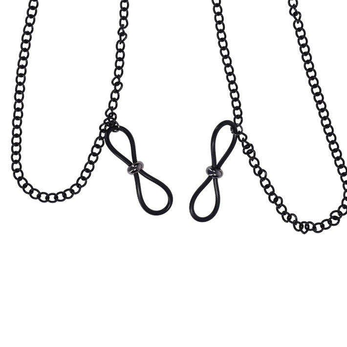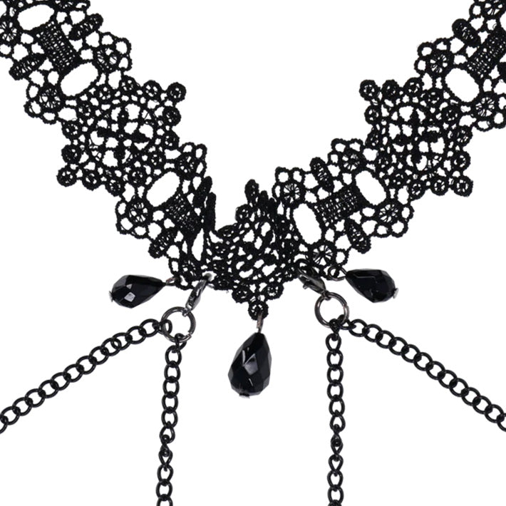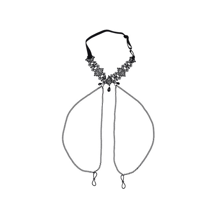 You've never looked or felt as aroused and alluring as you will in this Lace Collar with Nipple Ties. Gothic beauty with an edge, the ornate lace collar shines with black rhinestones and fits comfortably around most necks. Dual detachable chains drape down your body, ending in adjustable silicone nipple ties that give you as much of a revving pinch as you want. Create a look that's as exciting for you as it is for the crowd when you pair this accessory like no other with dancer wear. Pair with lingerie, layer under clothing for a sexy secret, or include as part of a kinky BDSM scene.