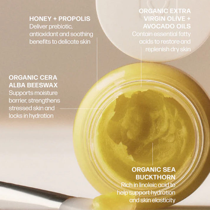 Ingredients: Organic Extra Virgin Olea Europaea (Olive) Oil, Organic Cera Alba (Beeswax), Organic Extra Virgin Persea Gratissima (Avocado) Oil, Organic Proprietary Honey & Propolis Blend (Organic Honey, Organic Royal Jelly, Organic Sunflower Lecithin, Organic Propolis, Organic Bee Pollen), Organic Hippophae Rhamnoides (Sea Buckthorn) Oil
