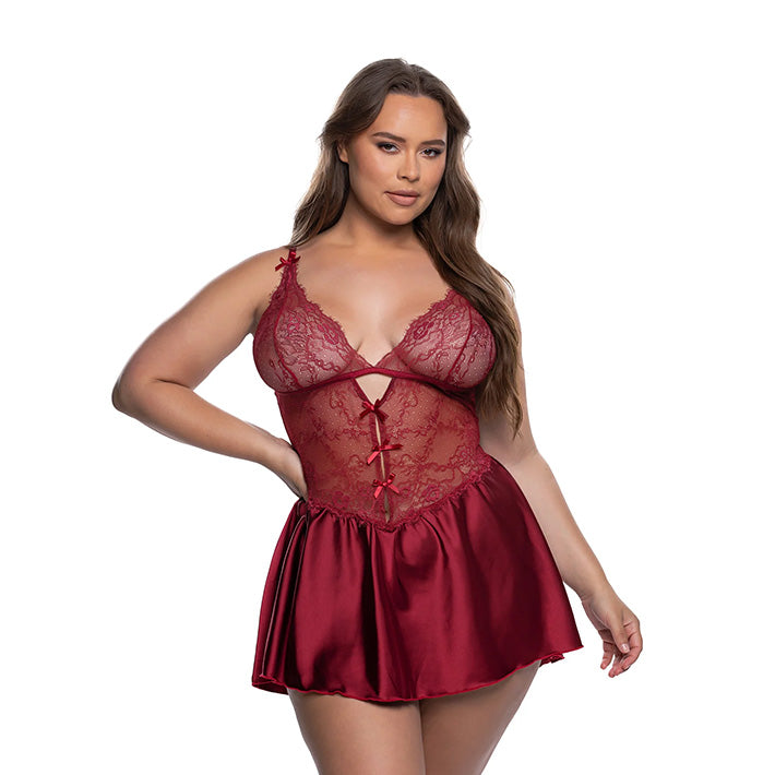 All dressed up...but staying home? Perfect. This gorgeous Chantilly lace and chiffon babydoll is the perfect gift for yourself or a lover this season. The deep wine color of this lingerie piece compliments every body with a plunging bralette cup, a flirty gathered skirt and keyhole cutouts down the bodice. Satin trim adds even more luxe to the look and a matching thong panty completes the set.