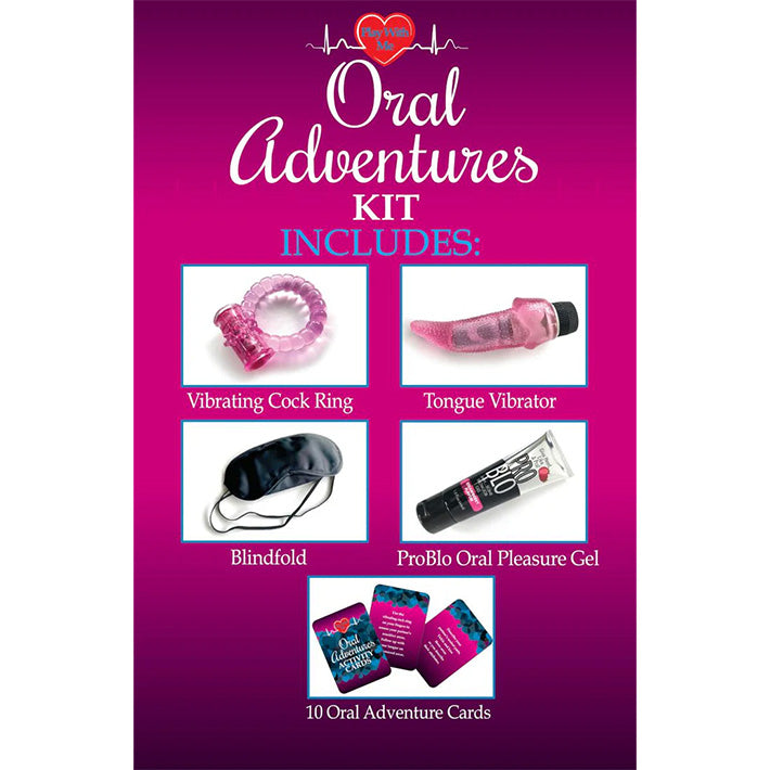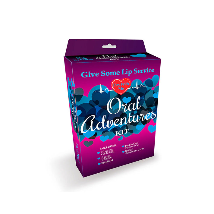 Let's go on an adventure! The Play With Me Oral Adventures Kit makes it easy to bring sexy, exciting oral shenanigans into your routine no matter where you are. Get wild and pull one of 10 oral adventure cards from the deck, then act on exactly what the card says or make it your own by incorporating the other fun and useful sex toys in the kit. Support your erection and please your partner with the vibrating cock ring. Tease and please nipples, clitoris, and more with the tongue vibrator. Bring sensory play to the game with the soft blindfold, and don't forget to lube up - there's a tube of ProBlo Oral Pleasure Gel included!