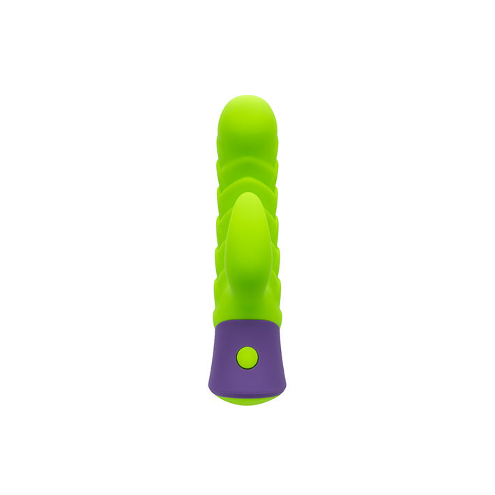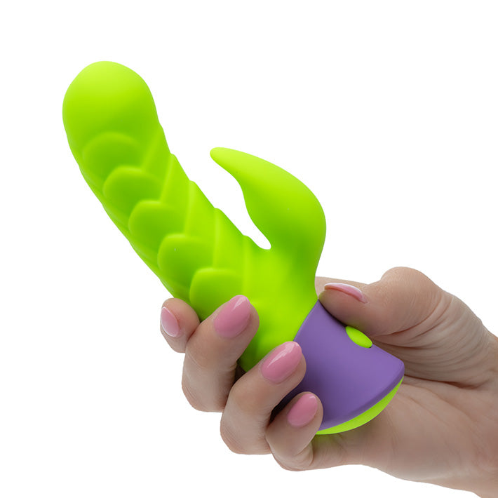 This scaled and stimulating rabbit vibrator promises to have you feeling warm all over when you use it. The Rave Dragon G vibrator is made of vibrant green, super smooth silicone and features textured dragon scales for added layers of sensation. The perfect amount of girth and curve with a broad, rounded head that hits all the right spots, this sex toy was made for adventure.