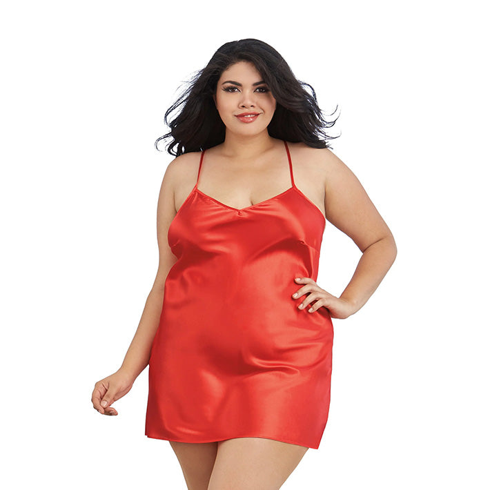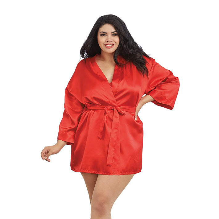 This perfect red set makes makes you the ultimate gift of the season. Satin charmeuse makes up the smooth and flowing lines of this chemise and robe combo, giving you the sexy look you want with the ease of wear you'll love. The short kimono-style robe features flowing sleeves and an attached belt so you'll never worry about losing it. The chemise has an ultra sexy low back with adjustable crisscross straps, making it a barely-there lingerie look you'll want to wear again and again.