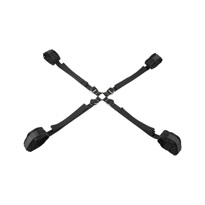 Explore a variety of bondage positions and the thrill of restraints with this adjustable Velvet Noir Hog Tie and Cuff Set. The 4 soft cuffs fit wrists and ankles up to 12.5 and are easy adjusted for comfort. The hog tie connector uses a central O-ring and 8 D-rings to create a web of tethers that allow you to limit mobility a little or a lot depending on the BDSM scene or roleplay you're creating. Pair with sex toys, a blindfold, or even a sensual massage oil that goes wherever the unrestrained partner wants to take things and enjoy all that this versatile set can offer!